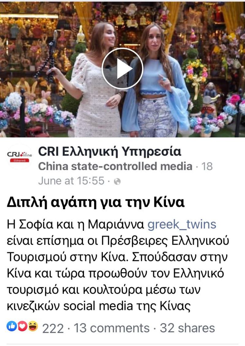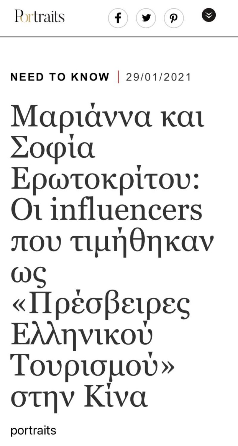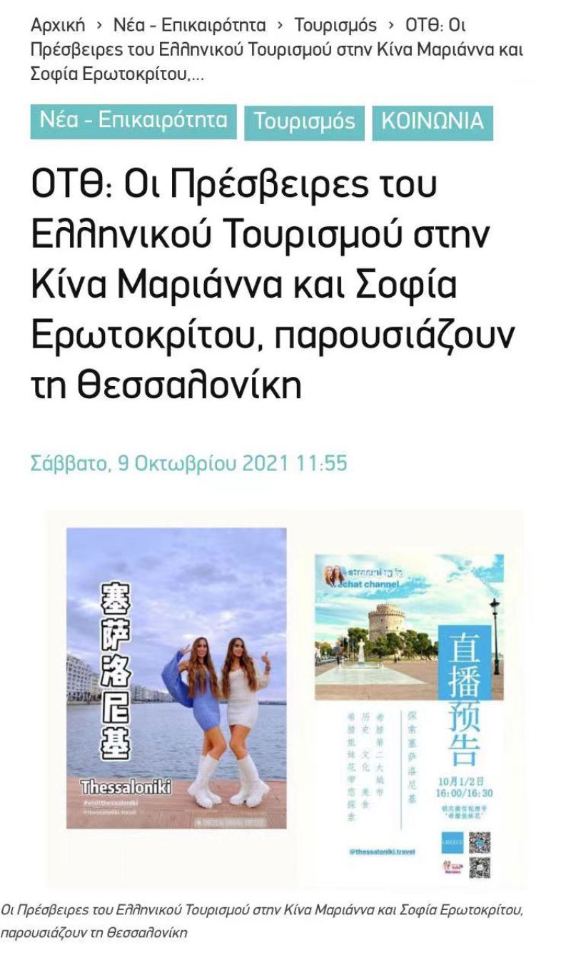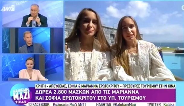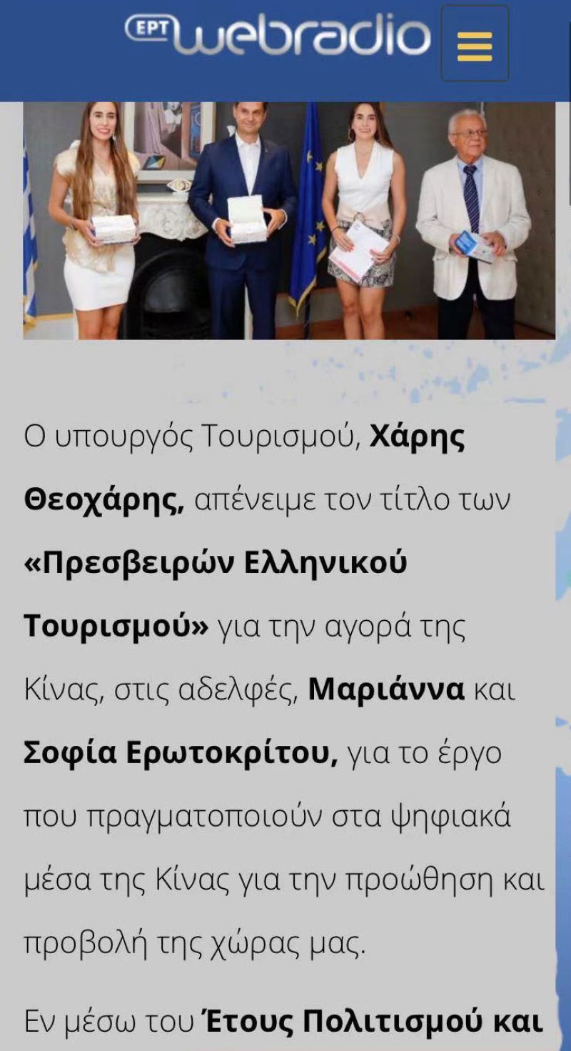 Τον τίτλο των «Πρεσβειρών Ελληνικού Τουρισμού» για την αγορά της Κίνας απένειμε ο Yπουργός Τουρισμού κ. Χάρης Θεοχάρης στις κ.κ. Μαριάννα και Σοφία Ερωτοκρίτου για το έργο που πραγματοποιούν στα ψηφιακά μέσα της Κίνας για την προώθηση της χώρας μας.