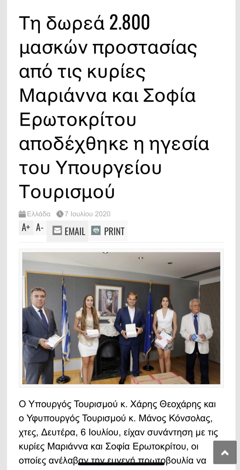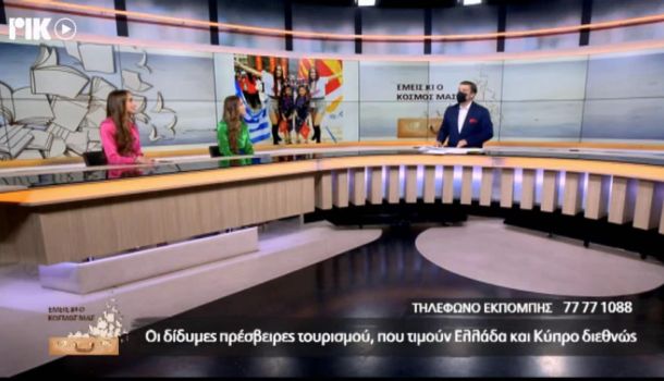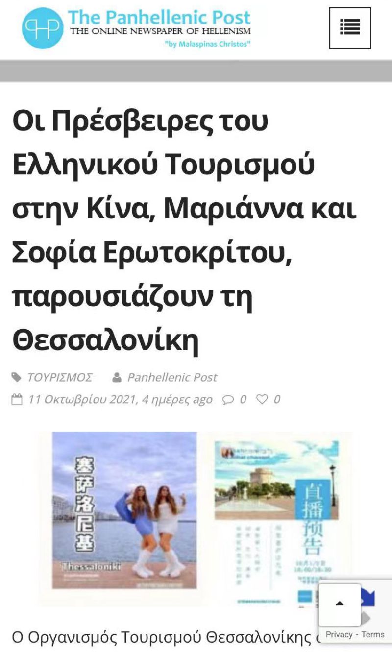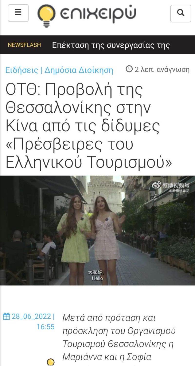 Τον τίτλο των «Πρεσβειρών Ελληνικού Τουρισμού» για την αγορά της Κίνας απένειμε ο Yπουργός Τουρισμού κ. Χάρης Θεοχάρης στις κ.κ. Μαριάννα και Σοφία Ερωτοκρίτου για το έργο που πραγματοποιούν στα ψηφιακά μέσα της Κίνας για την προώθηση της χώρας μας.