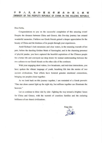Thank you letter from the Ambassador of the Peoples Republic of China in Athens.
