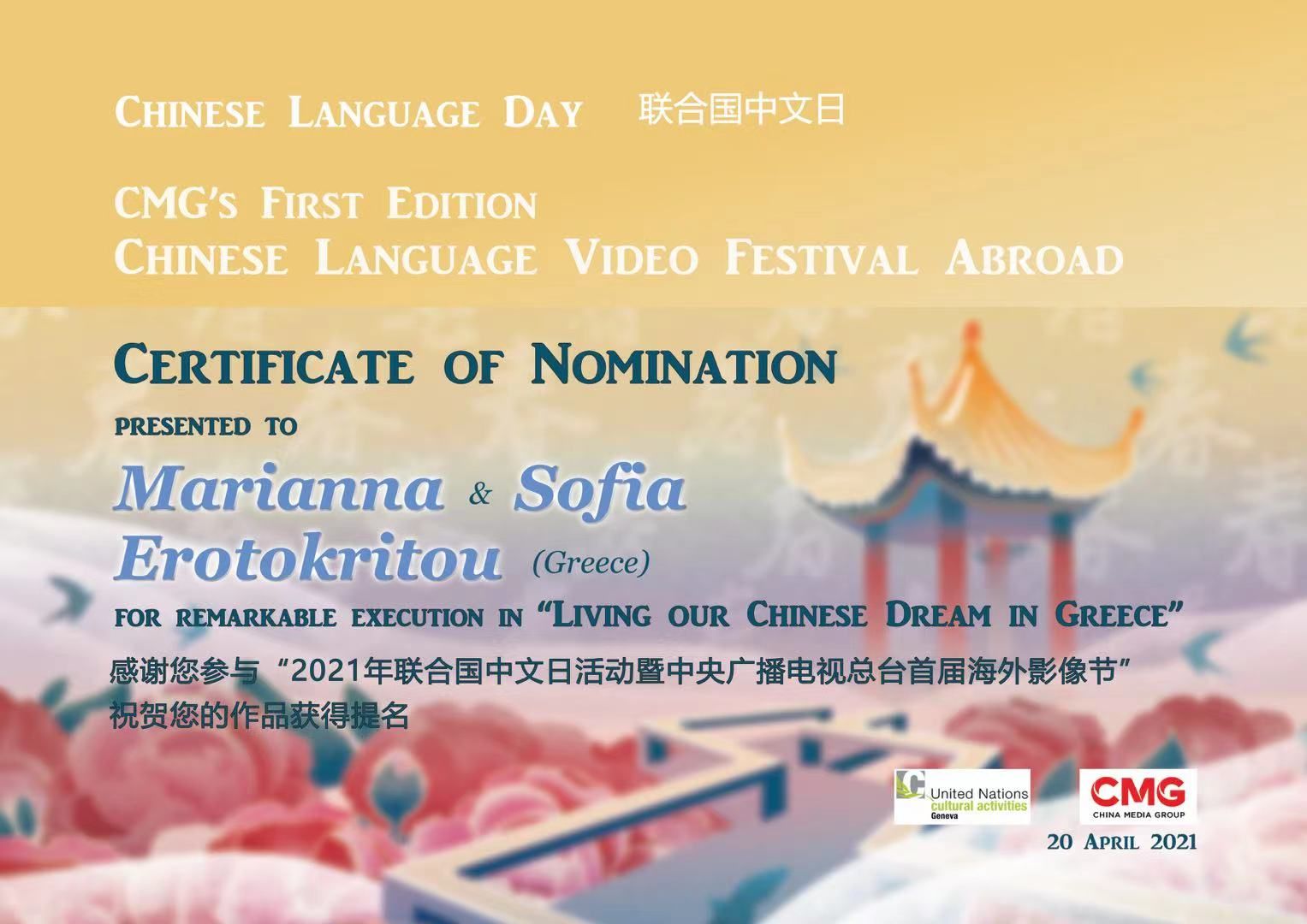 Special Award by the President of Cyprus for " outstanding achievement for the promotion of Hellenism in China "