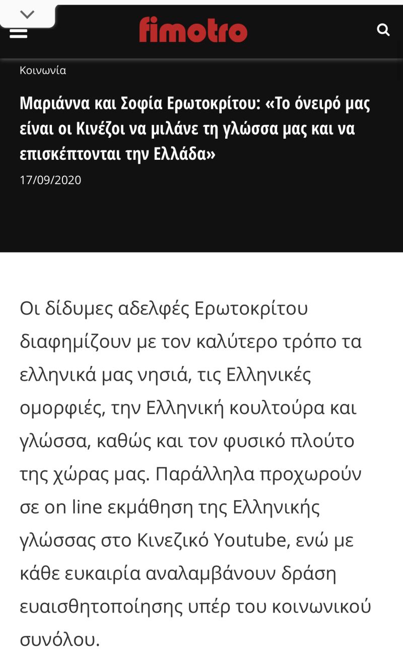 Through our videos we also have the opportunity to teach Chinese people basic Greek language knowledge. This is achieved through videos uploaded on the internet, receiving thousands of views, gracing us with more than 2000 grateful students who participate in our lessons, free of charge.